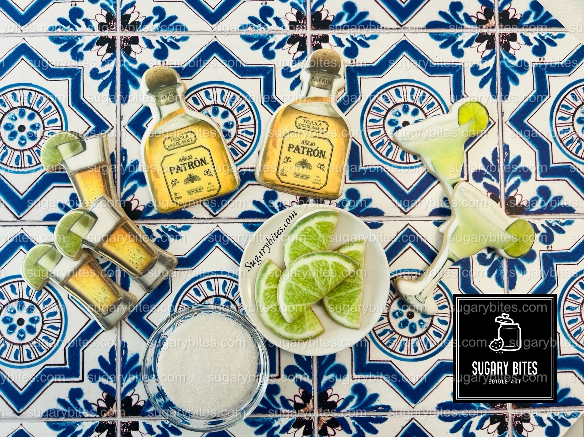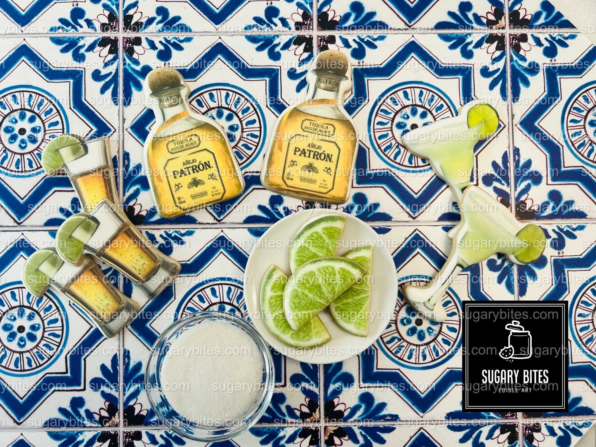Fiesta Cookie Set (12 Iced and Printed Cookies), Margarita Cookies, Tequila Shot Cookies, Lime Cookies, and Tequila Bottle Cookies.