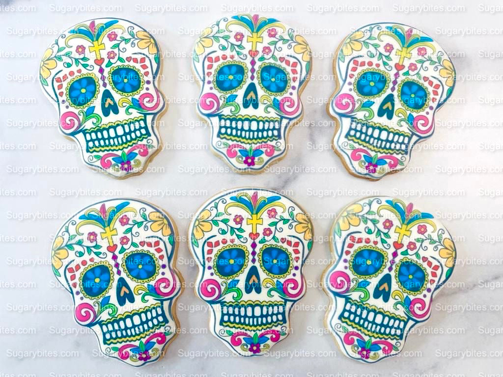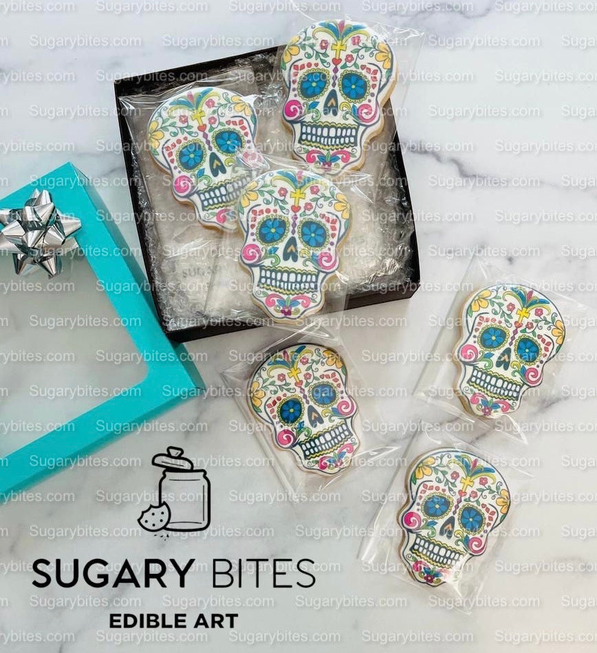Each comes with one dozen (12) SUGAR SKULLS COOKIES. Freshly baked Vanilla sugar cookies coated with our delicious made to order Royal Icing, the image is printed directly onto the Royal icing with an edible printer.
